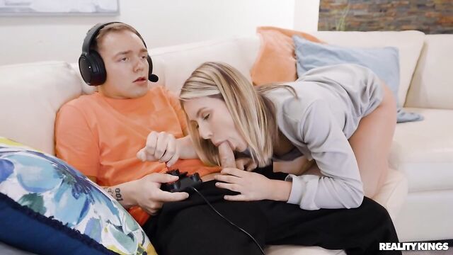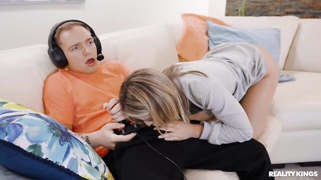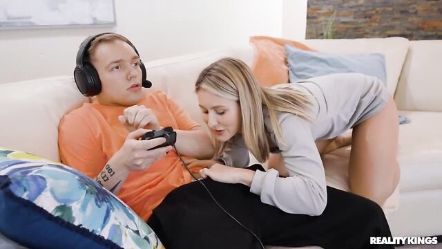 Description:Joshua Lewis got a new video game that's taking up all his attention, so horny blonde Paige Owens decides it's time for some serious tactics: tempt him away from the screen with anal! After stretching her ass with a plug she launches her attempt, but she only gets to suck and ride his cock before he ragequits. Paige didn't even get her ass stretched... but Joshua's joystick looks like it will do the job. And when this gamer finds his GF fucking her booty with his controller, he's gotta man up and give her the goods!