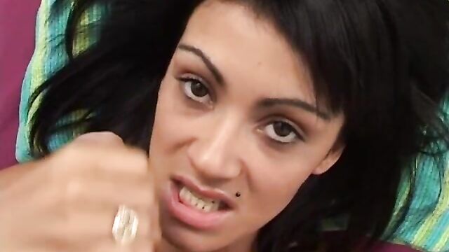Description:Latin slut Tanya puts her tongue piercing to work as she licks, sucks and blows on lucky stud’s hard cock until she gets that delicious cum all over her face.
