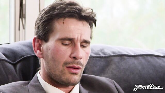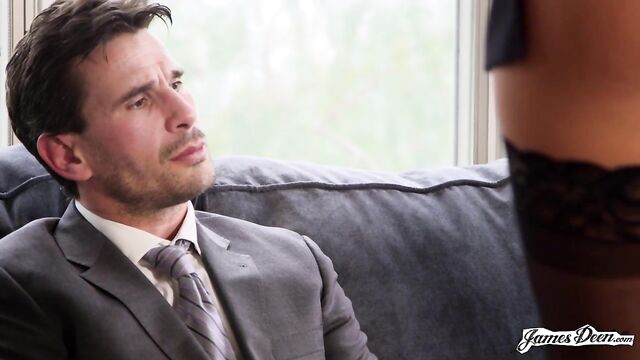 Description:Manuel Ferrera is on a meeting with a business partner. He sits on the couch while August Ames stands on the side, half-naked. Her big tits already exposed for him, his business partner and for the world to see. Her pussy, on the other hand, is still covered by her black lacy underwear. August slowly walks in front of him, hops on top of the table and bends down facing his dick still fully-clothed and exposing her bare ass cheeks to Manuel’s business partner. She unzips his pants until his cock sprang out and deepthroats him. He lightly strokes her hair and guides while she gives her a blowjob. With the meeting almost finished, Manuel stands up holding a pen and paper and puts her on her fours. He then uses her butt cheeks as a table as he signs his business papers. His business partner is focused watching them prepare to fuck. The meeting ends and the business partner leaves. Now the real action begins. Manuel begins caressing her butt cheeks as he teases her by rubbing his hard dick into her wet and tight pussy. The two now sit on the gray couch, kissing. August could no longer contain herself as she heads down to suck his big cock, taking his full length into her mouth without any hesitation. Manuel, now turned on, hurriedly takes his pants off and positions them in a scoop me up position. He thrusts his dick inside her shaved pussy as he lifts one of her legs up. He fucks her hard and kisses her on the lips, all at the same time. He pulls out, leaving her craving for more. August excitedly hops on top of him in a cowgirl position, grabs and inserts his dick into her pussy and rides him hard. With both of them feeling that they are about to reach their peak, Manuel takes control of the situation once again. Their rough sex continues as he goes for the missionary position. Not satisfied with the sensation that the position is giving them, he lifts one of her legs as he humps her hard. He pulls out again, allows her to give him a blowjob and then fucks her again in doggy-style. August Ames and Manuel Fererra are now lying on the couch, He licks and sucks her foot before she kneels down on the floor and sucks his hard dick once more. She continues mouth-fucking his cock until he comes all over her face.