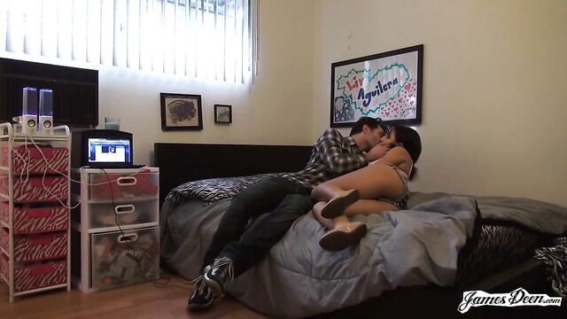 Description:A cute little puppy shows up first on the camera before it focuses on Liz Revamped who is patiently but excitedly waiting for someone in her bedroom door. She wears a fitted patterned long-sleeved cropped top and denim shorts. She welcomes James Deen who is wearing a patterned long-sleeved polo and denim jeans into her bedroom. James and Liv are comfortably seated on the bed as they talked for quite awhile. The conversation between the two is taking too long that Liv is becoming impatient that she seems uneasy. She keeps standing up and sitting down, becoming even more anxious thinking that the conversation is never going to stop until James leans in and kisses Liv on the lips. Liv hurriedly takes off her top and takes his full-length inside her mouth giving him a blowjob as James takes his time in getting rid of his clothes. He slowly takes her shorts off as she continues to deepthroat his cock until he it turns hard. James then puts Liv on her fours and enters her tight pussy from behind. He fucks her hard in the doggy-style position before switching sex positions. He lies down on the bed as Liv hops on top of him, slightly guiding his big hard cock inside her pussy. She rides him in the cowgirl position. James sits down, without pulling his dick out of her pussy. With his dick hitting the right spot inside of her, she humps his dick crazily. James suddenly pulls out knowing that another move from her can make him come. He puts Liv on the bed and devours her pussy until she is fucking wet. He then slowly inserts his big hard cock inside her wet and tight pussy. He just loves the way her pussy opens up and adjusts to his size. He fucks her in the missionary position before lifting one of her legs up turning her on even more. James switches their position into the reverse cowgirl, fucking her until he reaches his peak. James Deen and Latina beauty Liv Revamped finish fucking in doggy-style. Just when he is about to orgasm, he pulls out and releases his warm cum into her big ass.