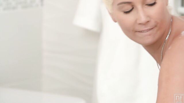 Descrizione: Sharon White loves her lingerie and silky robe. She also loves her baths. When she can combine all of the above, she knows it's going to be a very good night indeed, even when she's on her own. Admiring herself in the mirror, she slips the robe down and then lets the sheer bra and thong follow suit. When she's finally nude, she slips into the tub.There are plenty of bubbles for Sharon to rub all over her tight body. From her enhanced titties to her toes, she's soon nice and sudsy. The slippery skin makes it easy for her to glide her palms wherever her fancy takes her as she warms herself up.Just as things are getting nice and heated, Raul Costa joins Sharon in the bathroom. He rubs her neck and shoulders, then captures Sharon's lips in a kiss as he moves lower. Those tender breasts have been waiting for the feel of Raul's big hands as he kneads and squeezes them. Sharon's pussy is equally primed for Raul's touch.Getting on her knees in the tub, Sharon brings the party to Raul by pulling his stiffie from his pants. Opening nice and wide, she sucks him down and then runs her hand up and down the shaft. Her invitation for Raul to join her in the bath and fuck her in doggy is one that Raul is happy to take up.Relocating to the bedroom for added comfort, the couple really takes their time with one another. Raul goes back to work on Sharon's tender breasts as he worships each nipple. Then he hooks his arm around Sharon's thigh to hold it out of the way and open her pussy for a feast.Turning onto her side, Sharon moans in delight as Raul spoons behind her and goes deep. He gets even deeper when Sharon rolls onto her back and lets Raul pump her nice and full of the D. Her big tittes bounce with every stroke of Raul's dick, doubling down the delight for them both.When Raul lays down on his back, Sharon is quick to take over. She crawls on top of him and sinks down until she's fully impaled on his stiffie. The gentle motion of their ocean is just the perfect way to get Sharon moaning as Raul plays stud to her tight twat. He hangs on as she bounces that booty in reverse cowgirl, enjoying the last climax of the day.Sharon isn't about to leave Raul unsatisfied now that he has made her feel so good! Getting on her knees, she delivers a handy to bring him that last little bit over the edge. Propping her boobs up to create a landing spot, Sharon jerks Raul to orgasm and then smiles at the mess they both made.