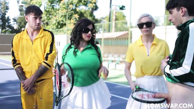Descrizione: Mona and Kenzie invite their stepsons Nade and Nick to join them in a friendly tennis showdown as practice for an upcoming mother/son tournament. It’s the perfect opportunity for the gals to step outside and feel accomplished one more time. Kenzie and Mona are clearly more experienced and competitive, so they get worried when they see their stepsons are not nearly as good as they need them to be, so they decide to swap sons and practice with them 1-on-1. What they don’t know is that the reason why their boys are so distracted is because they are horny just from watching each other’s stepmom play! Mona and Kenzie are nothing if not understanding, so they help Nade and Nick cool down their boners with a hot foursome, so they can focus on properly learning how to play tennis.