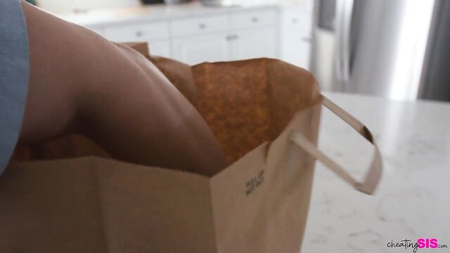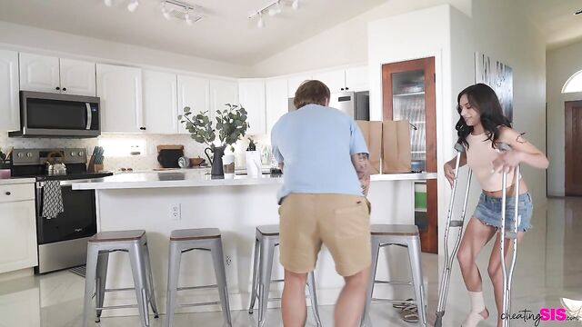 Description:Aria Valencia sets up a camera I the kitchen and then goes to tell her stepbrother to stay in his room until she tells him to come out. She offers to do his chores to make sure that he complies. Once Aria has assured her privacy, she skips to the kitchen where she bandages her foot and waits for a delivery with crutches at the ready.Aria is expecting a grocery delivery, and when it arrives, she crutches her way to the door where Joshua Lewis is waiting with her goods. She begs him to come inside and help her unpack, and after a moment's hesitation he agrees. It just takes accidentally-on-purpose dropping one of her items to get Joshua on his knees so he can see that Aria isn't wearing anything beneath her miniskirt. She shoves his face into her pussy to eat her out, bringing her plan to full fruition.Turning Aria around so that she's kneeling on a stool, Joshua slams into her from behind. She gets on her knees to suck him off and then urges him onto the island so she can ride the stiffie. They get freaky on a stool as Aria's moans grow in intensity. When Aria gets back on her knees and takes a mouthful of cum, she swallows it and then tells Joshua he can go now. Wandering back down the hallway naked, she tells her stepbrother that he's welcome to come out now.