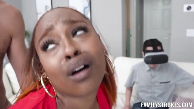 Description:Juan is so obsessed with his new VR headset that he doesn’t even pay attention to his hot girlfriend, Destiny. Bored out of her mind, she peeks at Dan’s room, Juan’s stepbrother. The boy is having a chill jerk-off session, a picture that gets Destiny all horned up. After locking herself in the bathroom to play with her pussy, she decides it’s time to get some dick. The mischievous girl brings Dan to the room where Juan is zoomed out playing with his VR headset and starts fucking with his stepbrother in front of him. A couple of minutes later, Juan snaps out of his game to find the intense sex scene happening in front of his eyes. Initially, he feels crushed, but Destiny convinces him to join them in a sexy bonding moment.