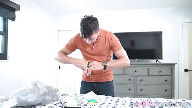 Description:Lucky for Kai Jaxon, he's a handy guy. He gathers a few items; a chips can, rubber gloves and some sponges to build himself a fake pussy to fuck. But when his stepsister Kona Jade sees him begin to craft his faux vagina, she knows perfectly well what's up! Kona tells her stepbrother she wants to watch him use his new toy. Kai is weirded out by his stepsister's voyeuristic tendencies, but wants to nut and get this over with. Kona watches her stepbrother struggle with his homemade pussy - it looks dry! She gets down on her knees and begins to suck her stepbrother's fat cock. She tries to fit it in his toy, but it's just too big so she decides to keep sucking and jerking it. Blowing her stepbrother got Kona's pussy all wet and now she wants him to lick it. Once he's eaten his stepsister's pussy he penetrates her with his thick dick. Kona loves getting filled up by her stepbrother and cums hard as he fucks her - she even squirts! Kona climbs on her stepbro's hard member and twerks her pussy all over it. Kai manages to make his stepsister squirt again by pounding her really hard and then she lets him cum all over her face and in her mouth!