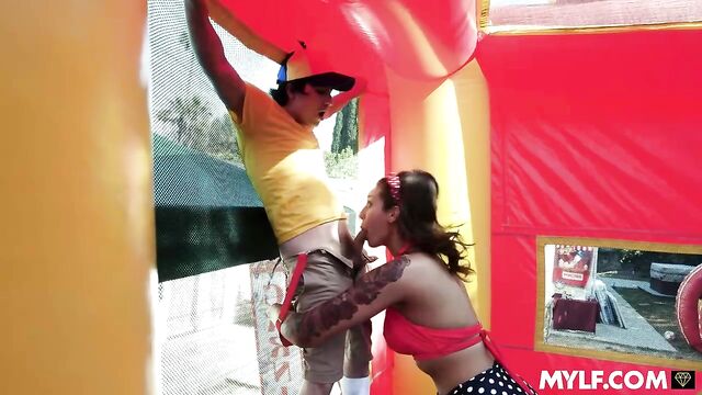 Description:Ricky sneaks into a weird carnival filled with strange attractions. The carnival master greets him and shows him the different games he can play if he truly believes. The best of all is the prize: meeting the beautiful Anastasia. Ricky wins every contest without any problem, only to find out the lovely Anastasia is a dude. Bummed, he moves on to the next attraction: Bella, the strongest woman on the planet. The ripped milf is lifting some weights when she meets Ricky. The boy is instantly attracted to her, but he’s no match to her strength. However, the boy will get his chance to feel her ripped boy when he competes against her in a friendly wrestling match in the bouncy castle. Bella has no mercy on him as she manhandles Ricky and takes him on the ride of his life. Lucky for him, it involves lifting the boy to suck his hard cock and letting him pound her strong pussy for the big finale.