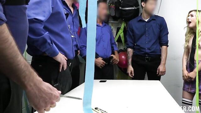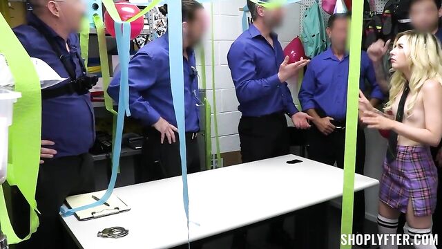 Description:They say that the third time's the charm, but Minxx is caught again shoplifting. Her choice of day couldn’t have been better, as all of the officers are at work celebrating the final day of one of their coworkers. Minxx puts up a feisty fight when brought in for questioning, but knows exactly how the rodeo will go.